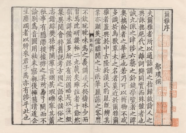 《尔雅注疏》,晋郭璞(276-324)注,宋邢昺(932-1010)疏,为唐宋间所修《十三经注疏》之一。《尔雅》一书,为读经之锁钥,辞书之鼻祖,汉代即颇多注家。至郭注出,因其征引广博,信而有征,遂大行于世,而他注式微。至宋,以前代孙炎、高琏等人之义疏浅近不经,邢昺等八人遂奉敕撰定新疏。