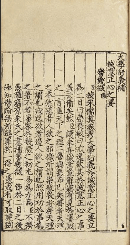 《大学衍义补》一百六十卷《补前书》一卷《目录》三卷,明丘濬撰,是宋末真德秀《大学衍义》四十三卷的续书。丘濬(1421-1495),字仲深,号深庵,琼州琼山人。景泰五年进士,长年在翰林院编书。自成化十三年掌国子监起致力编写《大学衍义补》,二十三年书成,进呈明孝宗。真德秀《大学衍义》只编了格致、诚正和修身、齐家,本书除补真书一卷外,主要是补“治国平天下之要”。设大目凡十二,包括正朝廷、正百官、固邦本、制国用、明礼乐、秩祭祀、崇教化、备规制、慎刑宪、严武备、驭夷狄、成功化。关于与真编的关系,丘氏进表自谦说:“前书主于理而不出乎身家之外,故其所衍之义大而简;臣之此书主于事而有以包乎天地之大,故其所衍之义细而详……前书其体,此书其用也。”其实二书都以广引历史上的政事为特色,体近类书。