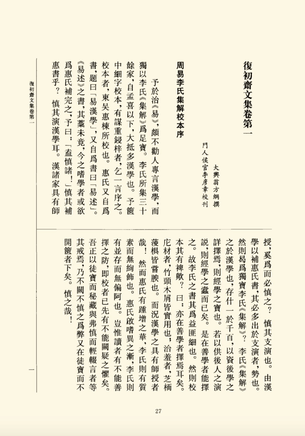 《复初斋文集》35卷,乃翁氏殁后由弟子福建侯官李彦章搜辑遗文编集而成。李氏校订未毕而卒,道光十六年(1836)梓行,颇多讹误。李氏之子以烜继承父志,从丁丙、丁申处借来手稿,重加校订,于光绪三年(1877)就原版挖补重刊,是正600余处。翁氏稿本曾藏魏锡曾所,魏氏据稿本钞出《文集》未收文121篇,后稿本归刘承干,刘氏编为《集外文》4卷,刊于嘉业堂。
