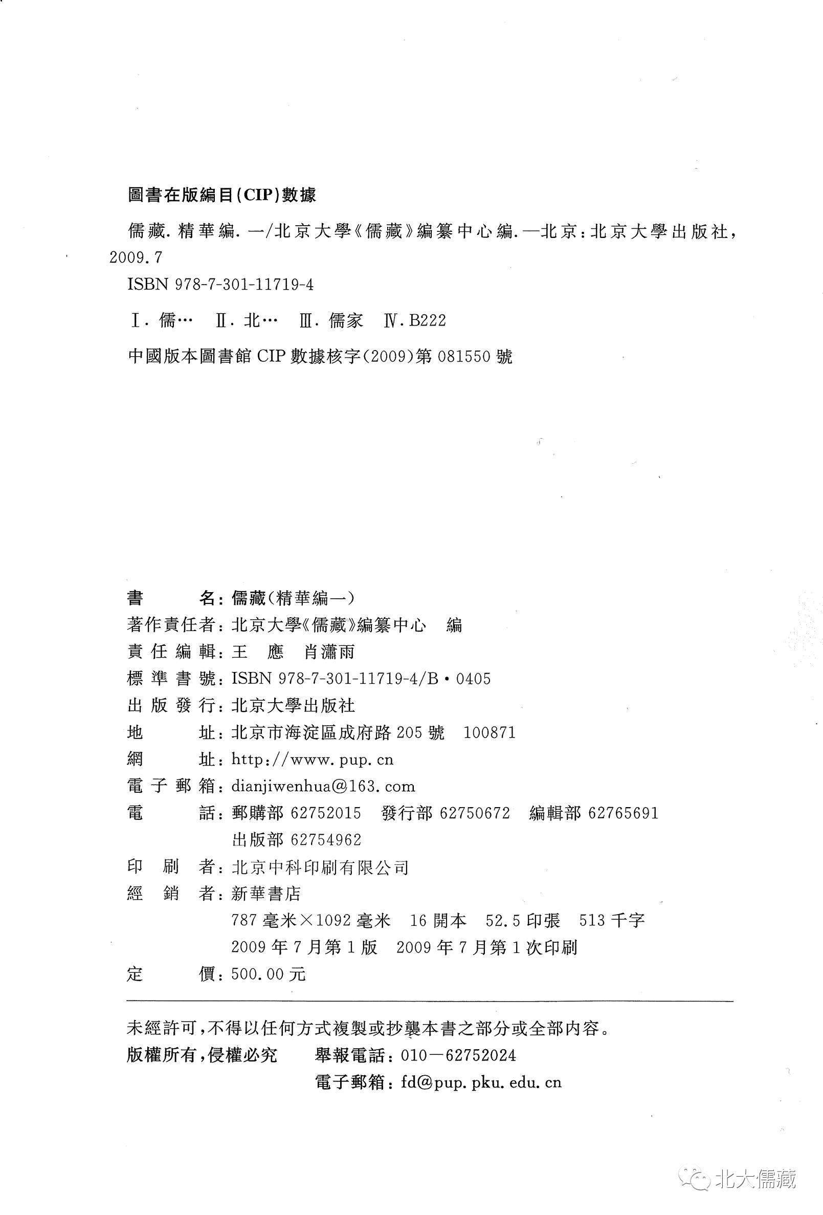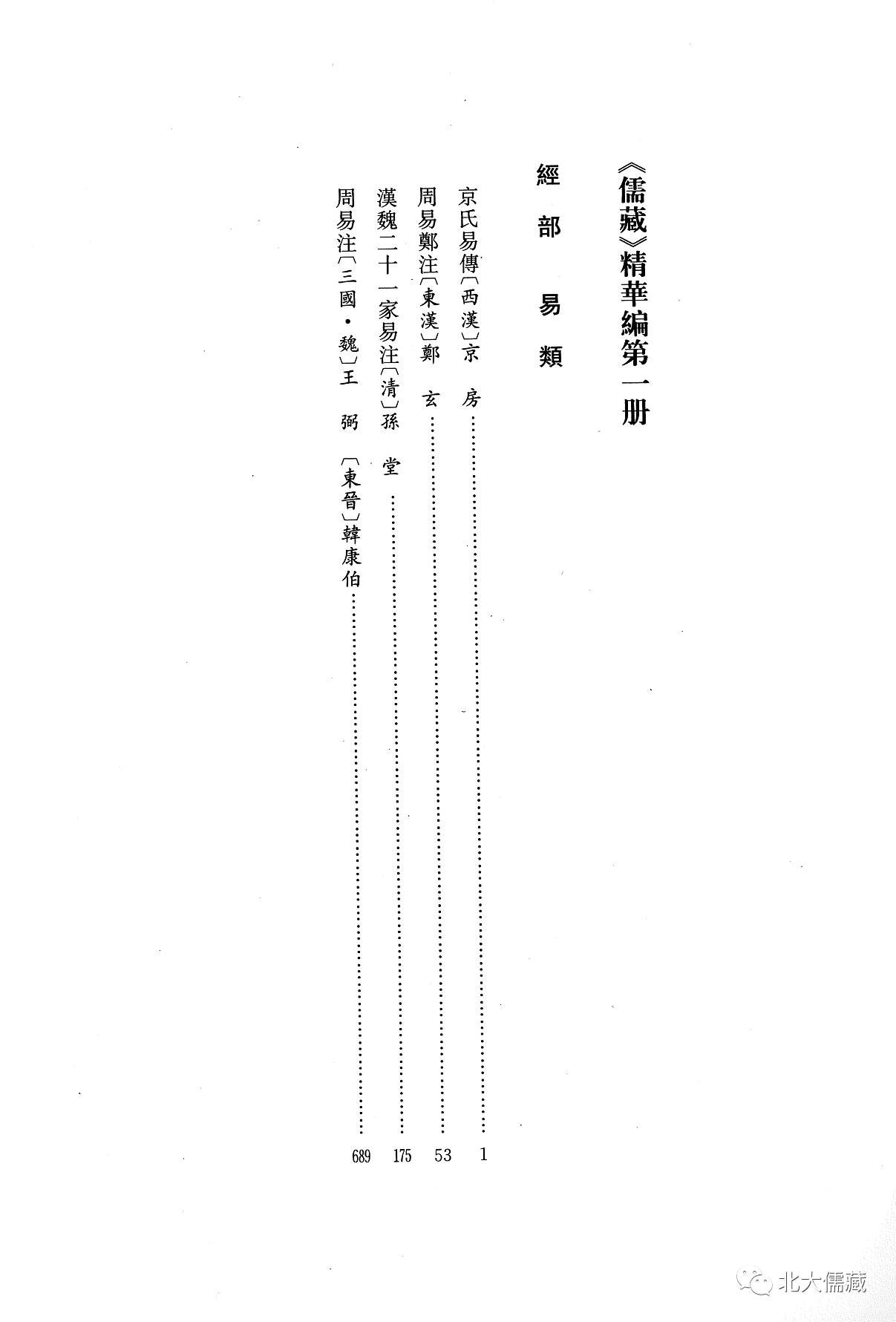 《儒藏》精华编第1册于2009年7月由北京大学出版社正式出版。此册隶属经部易类,共收录《京氏易传》、《周易郑氏注》、《汉魏二十一家易注》、《周易注》等四部汉魏时期易学著作。