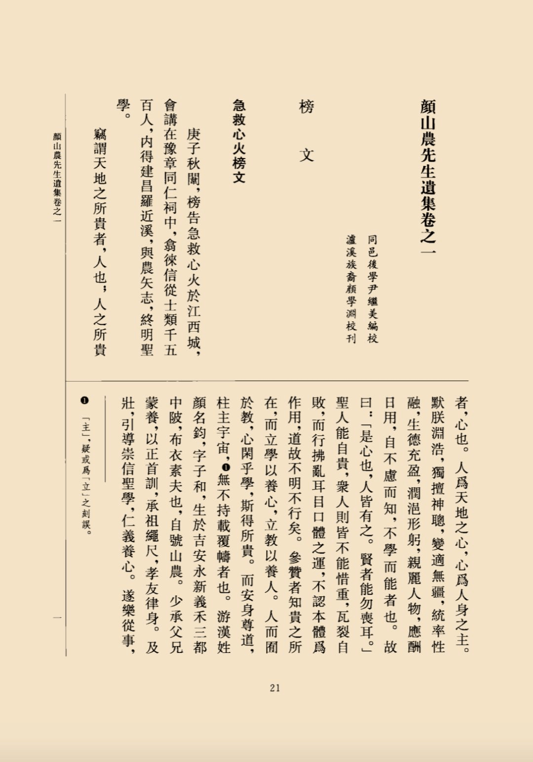 《颜山农先生遗集》为明代思想家颜钧的著作。颜钧(1504—1596),字子和,号山农,江西吉安府永新县人。作为泰州学派的重要传人,他继承了泰州学派的平民儒学传统,思想上具有鲜明的平民性格。他的传道对象主要面向平民大众,著名的罗汝芳、何心隐即出其门下。颜钧四处讲学,抨击时弊,为当局所不容,后遭逮捕,经罗汝芳多方募捐救助得以出狱。颜山农的著作一直未能行世,直至清嘉庆初,方由颜钧裔孙特璋搜集、编辑成书。今本《颜山农先生遗集》成书于咸丰五年。