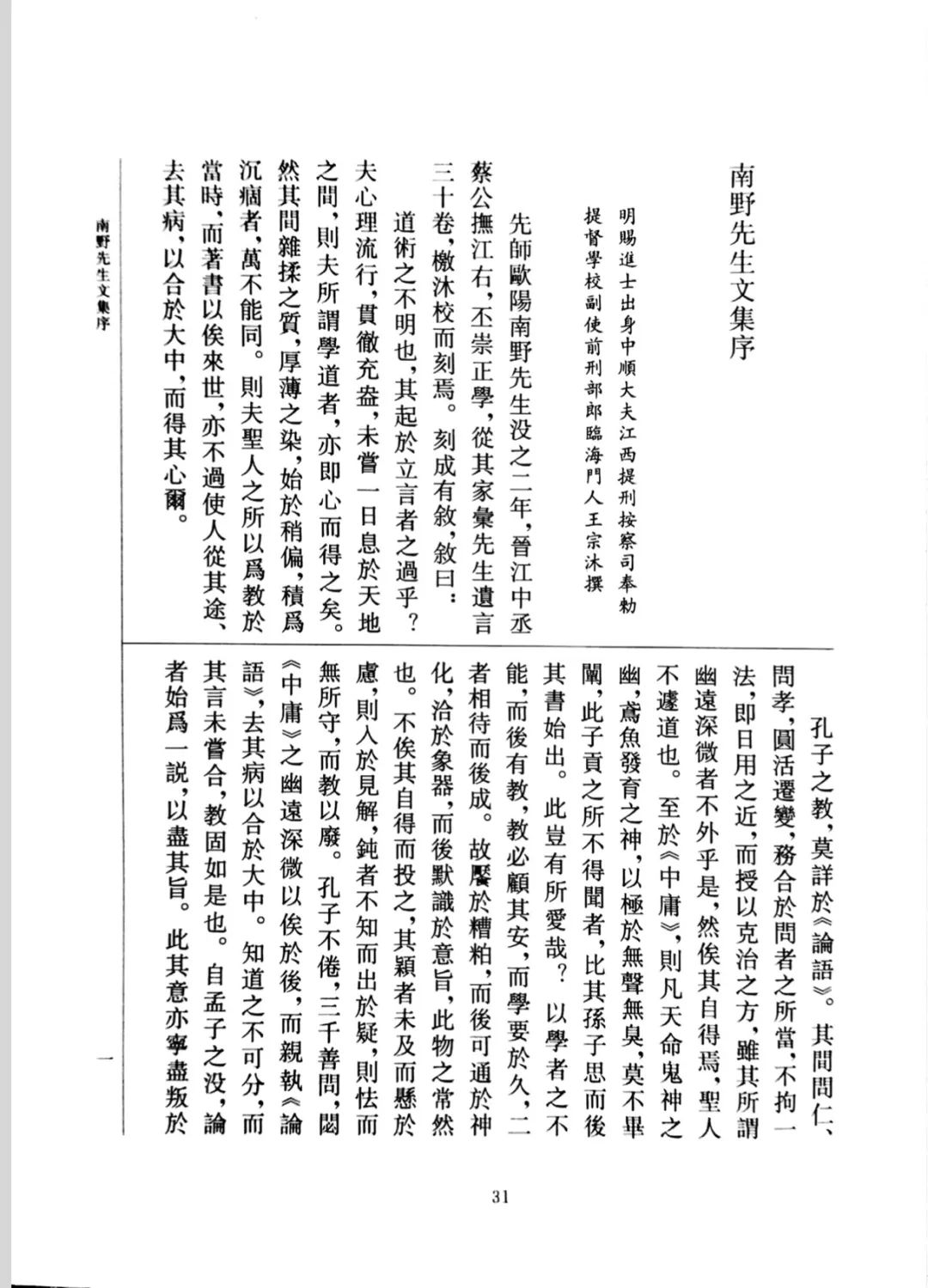《欧阳南野先生文集》三十卷,明欧阳德撰。欧阳德(1496—1554),字崇一,号南野,江西吉安府泰和县人。正德十二年(1517)从学王阳明于赣州,时已中举,而阳明犹呼之“小秀才”。欧阳德当时在门人中年齿最少,而阳明深器之,凡语来学者必曰“先与崇一论之”。欧阳德的思想,大抵本阳明所教而立言,创新之功少,守成之功多,而宣扬、捍卫之力尤巨。欧阳德生平之重要文献,皆收入门人王宗沐汇编的《欧阳南野先生文集》中,其中内集十卷为讲学之文,外集六卷为应制及章奏案牍之文,别集十四卷为应俗之诗文。欧阳德以讲学为事,凡所与人往复书信、赠言、别序,无时无刻不忘弘扬阳明学说,故内集十卷是其一生学术精神所聚。