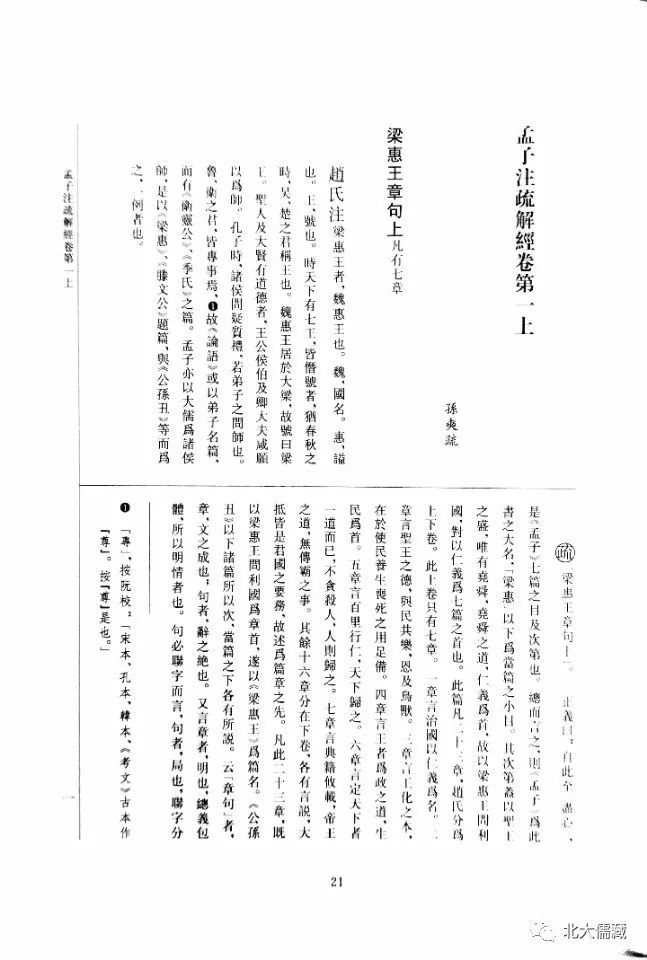 《孟子注疏》题名孙奭疏,相传是孙奭为赵岐《孟子章句》所作的疏。其体例大致符合通行之经疏样式,对经文及注文进行疏证,以通俗串讲为主。因其多敷衍赵注为说,对赵注之典故、史实往往不加注明,或说解错误,故前人对其评价不高。且疏文在每章下对赵岐“章指”有删节或改写,将其散入疏文,甚至增置于注文中,使“章指”原貌湮灭无存,至清人多方辑录,始得恢复。不过该书作为首部《孟子》注的疏解之作,有其开创之功;说解虽有疏误,但大致通达,亦不乏精善之见。后又收入《十三经注疏》,在孟学史上的价值及影响自不待言。