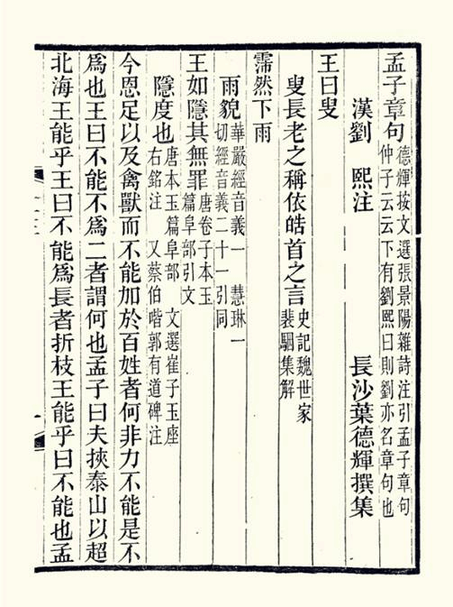 刘熙《孟子章句》除《隋志》外,仅为两《唐书》著录,盖唐以后渐亡佚。赖有裴骃《史记集解》、陆德明《经典释文》、《汉书》颜师古注、《文选》李善注、慧琳《一切经音义》、《原本玉篇》等征引其文。清代学者王谟、周广业、宋翔凤、黄奭、陈鳣、马国翰、王仁俊、叶德辉先后将这些零星资料采摭辑录,使后人尚得管窥刘氏《孟子》注之一斑。众家辑本中以叶德辉所采最晚出,也最为完备。叶本共辑得刘熙注六十二条,并附有《刘熙事迹考》一篇。就现存注文来看,刘注以字词释义、名物训诂为主,且大多较为详确,故而常被《史记集解》、《汉书》、《文选》等注家征引。另外,从刘熙注来看,其所据《孟子》底本与赵岐注本不同,为后人在赵注本外又提供了一个《孟子》古本。