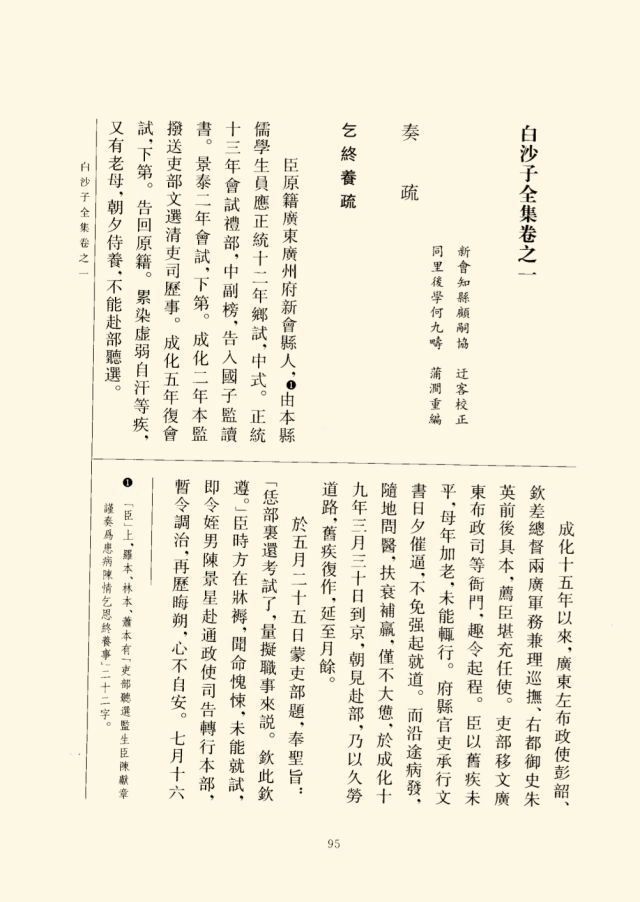 陈献章平生颇有诗兴,多寄理趣于诗,著述甚丰,其集亦经多次版刻。此书曾于1987年在中华书局整理出版,校点者为中华书局编审孙通海先生,定名《陈献章集》,所用底本为清康熙四十九年何九畴重刊本,此本远近搜访,所收较全。校本有明弘治十八年罗侨刻本、明正德三年林齐刻本、明嘉靖十二年高简、卞崃刻本、明嘉靖三十年萧世延刻本、明万历四十年何熊祥刻本、清乾隆三十六年碧玉楼刻本等。校点过程中,据校本补录诗文四十七首(篇),又辑录《白沙子诗文补遗》附于卷末,碧玉本所收湛若水《白沙子古诗教解》及阮榕龄撰《陈白沙先生年谱》,亦一并附于卷末。此次整理,由原校点者孙通海先生根据《儒藏》精华编体例进行了修改,同时订正了标点、排印中的一些错误,校勘文字也更为简明扼要。本书审稿人为北京大学出版社编审胡双宝先生。