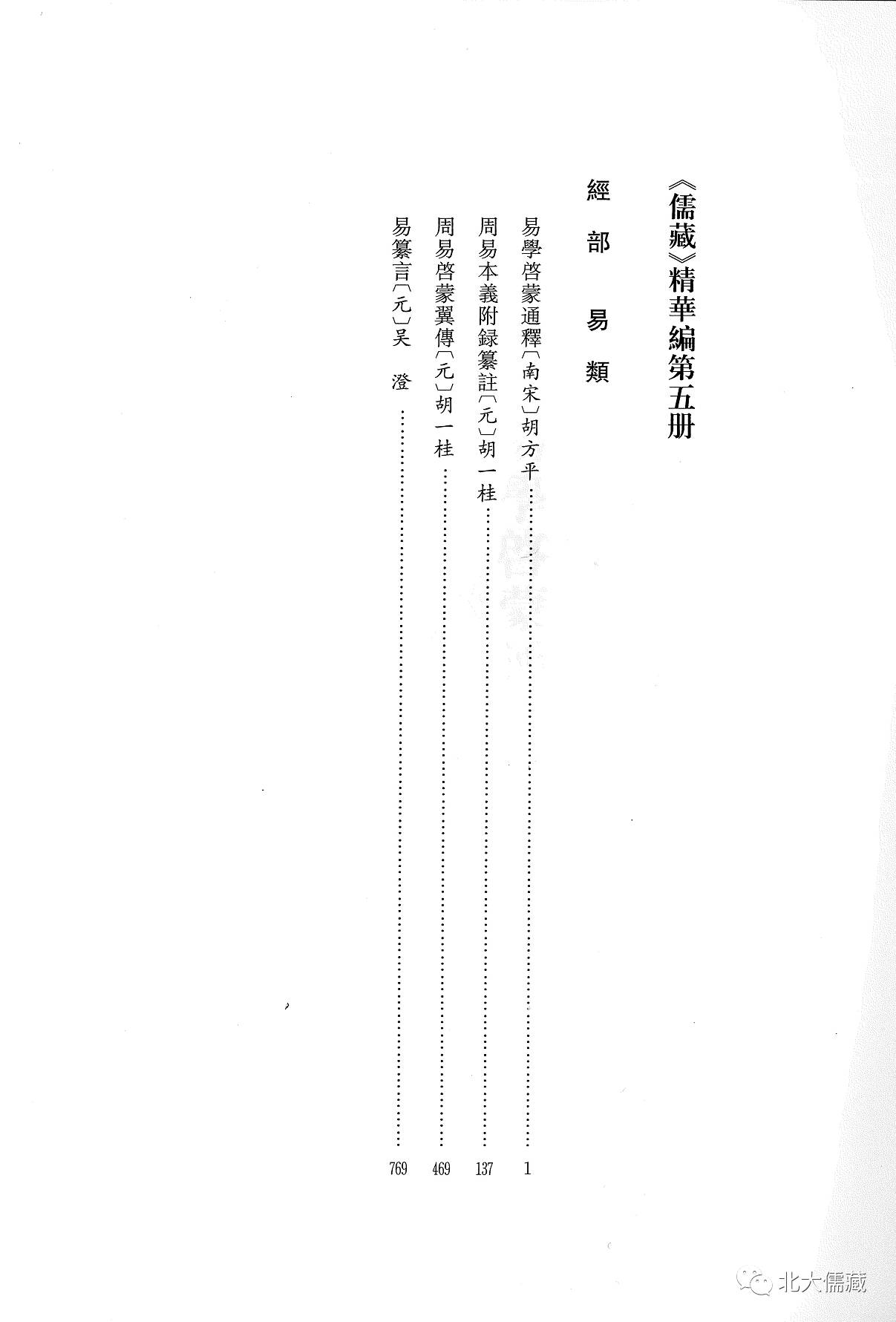 《儒藏》精华编第5册已于2014年4月由北京大学出版社正式出版。本册隶属经部易类,收录宋元之际象数易学著作四种:南宋胡方平《易学启蒙通释》、元代胡一桂《周易本义附录纂注》与《周易启蒙翼传》、元代吴澄《易纂言》。