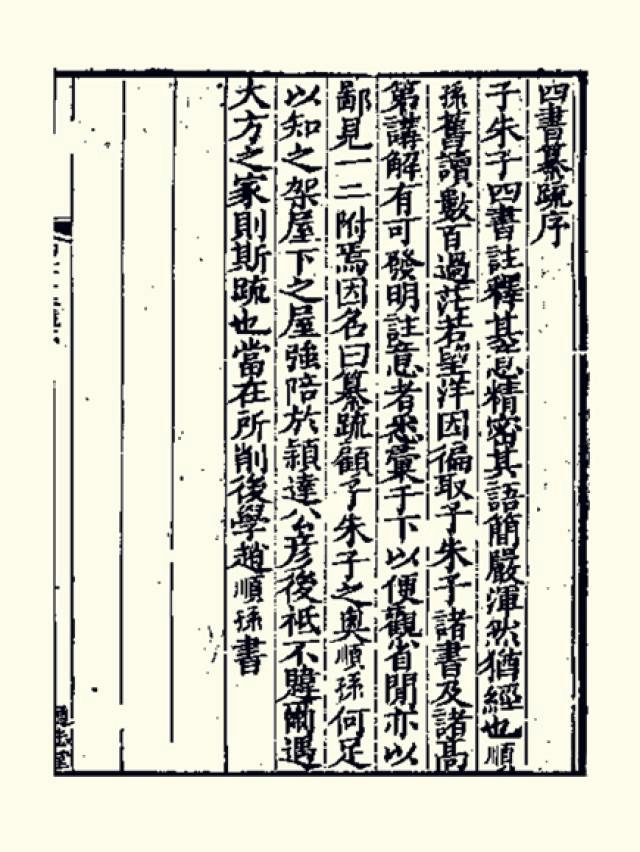 《四书纂疏》二十六卷,南宋赵顺孙撰。赵顺孙(1214—1276)字和仲,号格庵,缙云(今浙江缙云县)人。淳祐十年赐进士出身,除秘书省正字。咸淳改元,为秘书郎兼崇政殿说书。后忤贾似道,出知平江府兼淮浙发运使。复召升吏部尚书,进同知枢密院事兼参知政事。顺孙好学博敏,著述颇丰,《四书纂疏》之外,还有《近思录精义》若干卷,《孝宗系年录》若干卷,《中兴名臣言行録》若干卷,《文集》若干卷以及奏议若干,并藏于家。所著惟《四书纂疏》行于世。顺孙学宗朱子,得家学之传,为朱子三传弟子。终身用力于四书,溯求考亭之原委,自谓:“朱子四书注释,其意精密,其语简严,浑然犹经也。因编取朱子诸书及门人讲解有可发明注意者,悉汇注下,以便观省,名曰《纂疏》。”《四书纂疏》乃渐次单独成书:《大学纂疏》、《中庸纂疏》、《论语纂疏》、《孟子纂疏》,何时合刊无从考定。《四书纂疏》现存最早版本为《通志堂经解》本,初刻于康熙十九年,后有乾隆五十年补刊本、同治十二年粤东书局重刊本。此次校点整理,以《通志堂经解》康熙十九年初刻本为底本,以文渊阁《四库全书》本为校本。