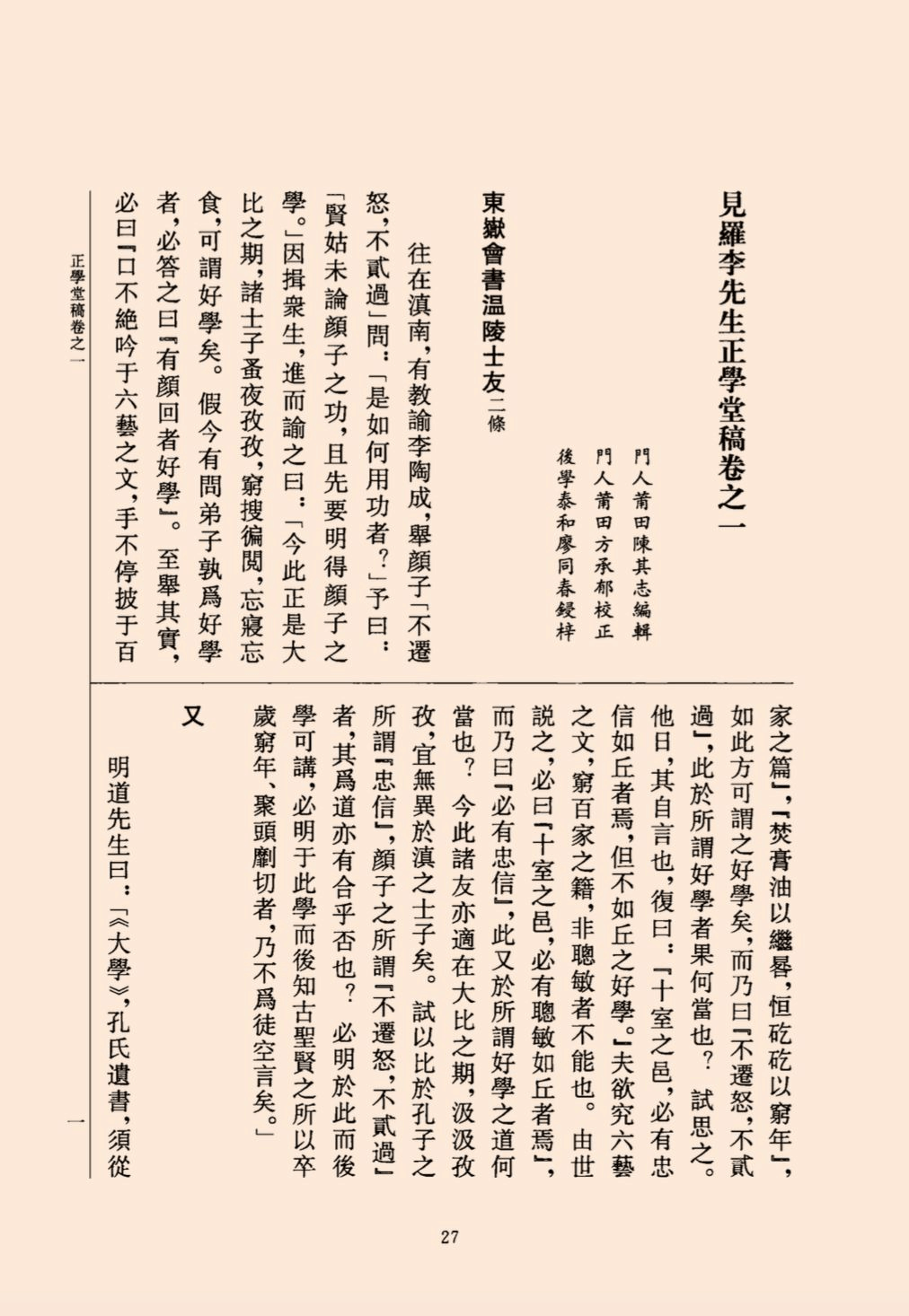 本册收录集部之明代部分的李材《正学堂稿》和耿定向《耿天台先生文集》。李材、耿定向都是王守仁后学,然皆注意纠王学末流之偏。《儒藏》精华编本皆为二人文集的首次整理。