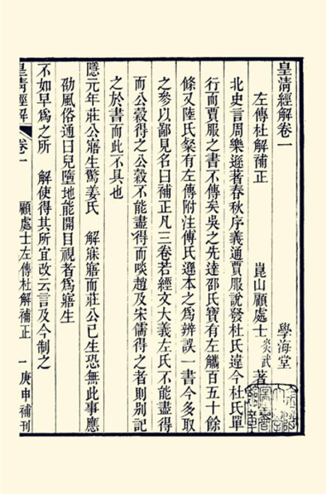 顾炎武(1613—1682),初名绛,字忠清,明亡后改名炎武,字宁人,自署蒋山佣,江苏昆山人。以其家乡有亭林湖,学者尊称亭林先生。顾氏生当明清易代鼎革之际,国破家亡的惨痛经历,使其对有明一代学术思想进行了系统反思与总结。在治学理路上,以经世致用为旨归,以考据征实为工具,知行结合,学思并重。在经学、史学、音韵、小学、金石考古、方志舆地以及诗文诸学上,都有较深造诣,取得了非凡的学术成就。被称作是清朝“开国儒师”、“清学开山”始祖。与王夫之、黄宗羲并称为清初三大家。其著述,今可考见者有50余种,代表作有《日知录》、《天下郡国利病书》、《肇域志》、《音学五书》、《金石文字记》、《亭林诗文集》等。
