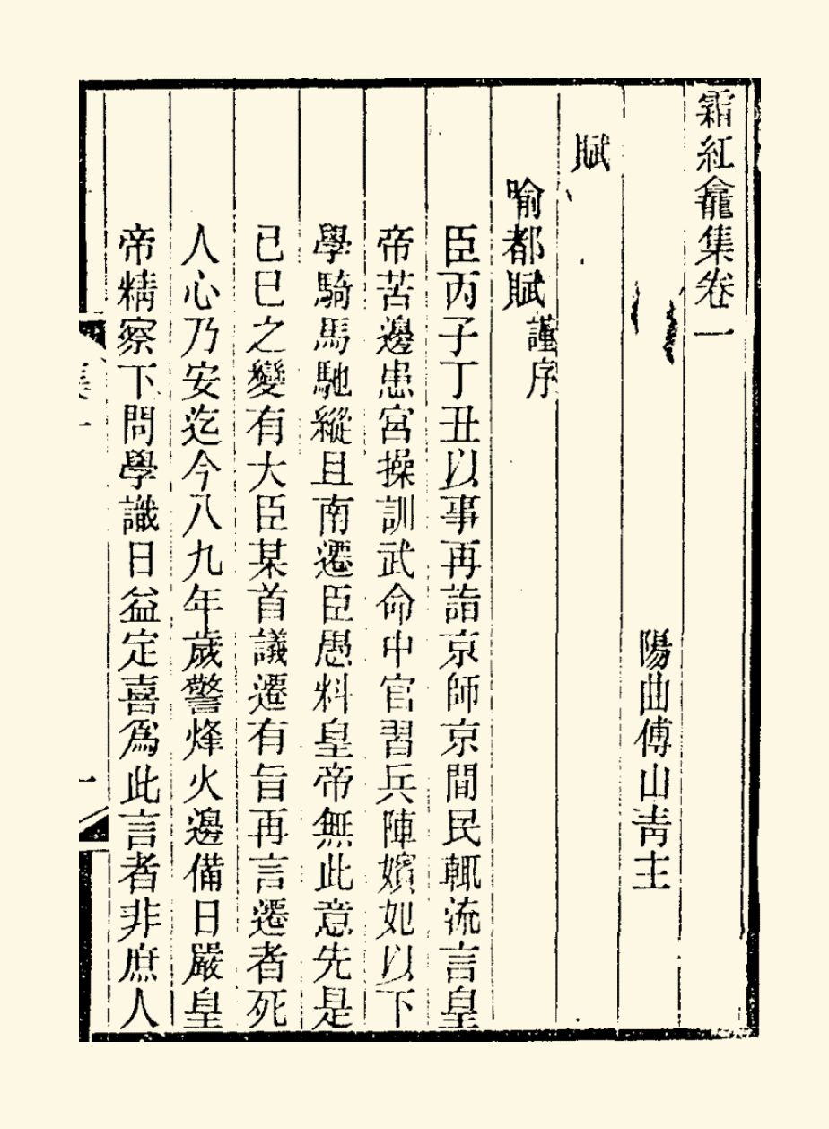 傅山(1607-1684),初名鼎臣,后改名山,字青竹,后改青主,别号石道人、朱衣道人等,太原阳曲县(今属山西)人。明诸生,山西提学袁继咸蒙冤入狱,傅山为之联络上疏赴京请愿,袁案得雪,傅山名闻天下。明亡,傅山联络南明密谋策划起义,事败被捕,绝粒几死,得救。清康熙中,被荐博学鸿词科,称疾固辞。生平详见书后所附全祖望撰《阳曲傅先生事略》及丁宝铨辑《傅青主先生年谱》卷,《清儒学案》将之列于卷七亭林学案下。傅山学问淹博,诗文皆精,工书善画,擅于医道,著述传世者除《霜红龛集》外,有《诸史批注》、《诸子批注》、《文选批注》、《杜诗韵字归部》、《春秋人名韵》、《两汉书姓名韵》等等(详见2016年山西人民出版社出版增订版《傅山全书》,全二十册)。
