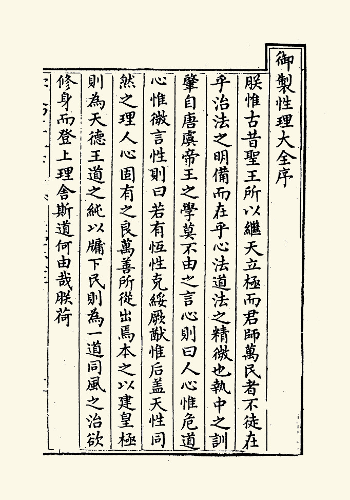 《性理大全书》在有明一代流行甚广,版本繁复,仅《中国古籍善本总目》、《书目》著录的明代善本就有二十余种。清代名为《性理大全书》的版本有两种:康熙十二年内府刻本,此本在明内府本基础上重修、校订,简称“重修本”;文渊阁《四库全书》本(简称“四库本”),此本乃据重修本抄写而成,但基于重修本对内府本的校订仍有讹误,故此本亦有改正重修本之处。本次校点,以永乐十三年内府本为底本,以康熙十二年重修本为通校本,参校以四库本。