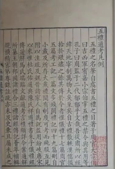 《五礼通考》成书后,有秦氏味经窝家刻本。复旦大学藏有此家刻本之初印本,天头地脚多有钱大昕、卢文弨、姚鼐等学者的校语,有些内容也较后印本为阙。应该说,此本是家刻本的一个校样。真正通行的味经窝刻本,已经大量吸收了初印本的校勘成果,国内各大图书馆多有收藏。除家刻本外,此书还有《四库全书》钞本、光绪六年(1880)江苏书局刻本。