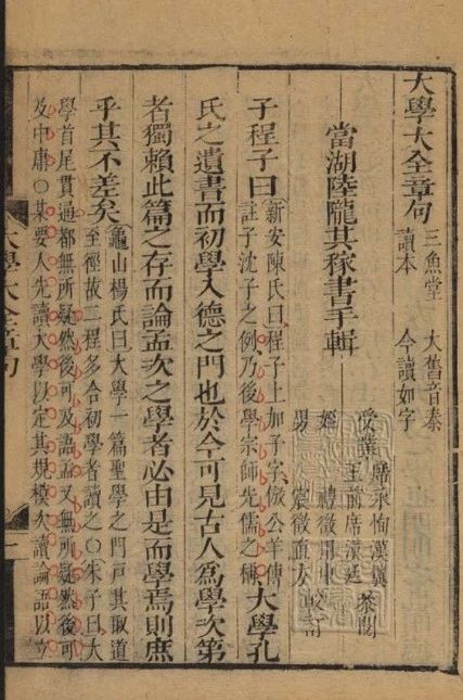 《三鱼堂四书大全》四十一卷,清陆陇其撰。陆陇其(1630-1692),初名龙其,字稼书,浙江平湖人。康熙九年进士。一生仕宦不显,历官江南嘉定知县、直隶灵寿知县、四川道监察御史等。雍正二年从祀孔庙,乾隆元年赐谥清献。