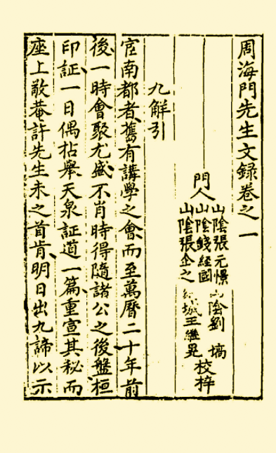 由于《文录》明确可知是由周氏弟子校刊,且文章保持了更原始的面貌,而《证学录》的校刊年代和文章改定人则不明确,所以我们选择《四库全书存目丛书》影印明万历张元憬等刻本《文录》为底本,分别校以清华大学图书馆、浙江图书馆所藏十六卷本《证学录》,择要出校,除去可以补正《文录》讹脱衍倒外,也试图展示两种本子之间差别的性质。此外,校点者还参校了通行本《论语》、《孟子》、《老子》、《庄子》、《王文成公全书》以及中华书局校点本《明儒学案》卷三十六《泰州学案五·尚宝周海门先生汝登》(简称“《泰州学案五》”)等相关文献。