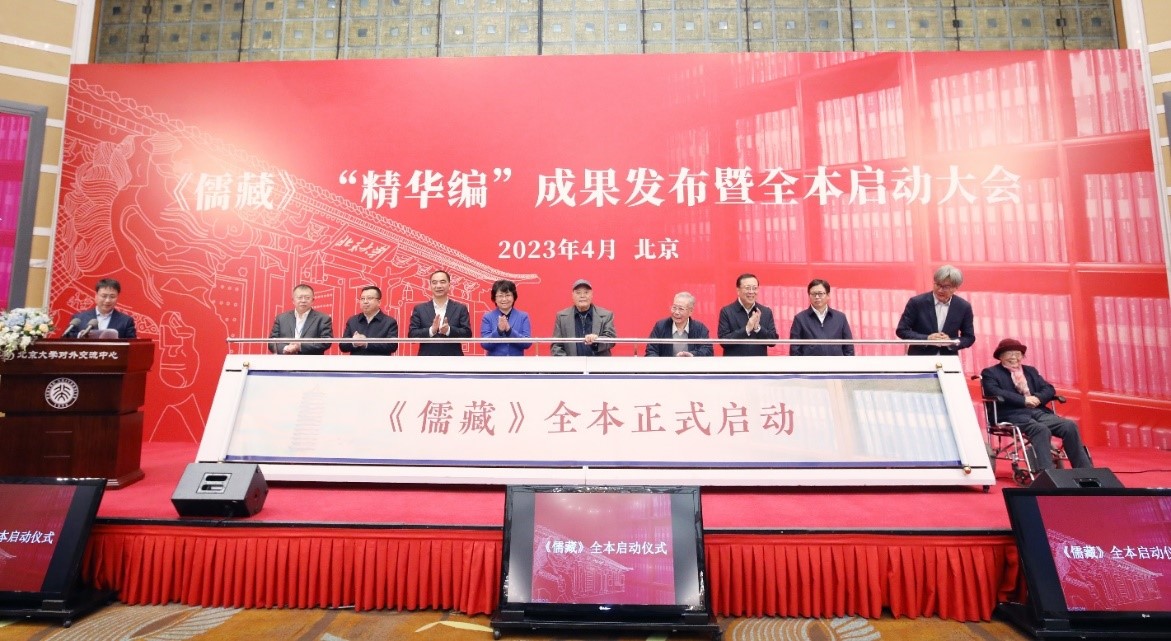 在北京大学125周年校庆前夕,为宣传介绍《儒藏》“精华编”成果,启动《儒藏》全本编纂,展现习近平总书记对《儒藏》工程的关心、支持和期望,探讨儒学思想文化的历史意义和当代价值,由北京大学主办、北京大学社会科学部及北京大学《儒藏》编纂与研究中心承办、全国高等院校古籍整理研究工作委员会支持的“《儒藏》‘精华编’成果发布暨全本启动大会”于2023年4月28日上午在北京大学英杰交流中心阳光大厅隆重召开。教育部党组成员、副部长翁铁慧,中宣部出版局局长、全国古籍整理出版规划领导小组办公室主任冯士新,教育部社会科学司司长徐青森,国家出版基金规划管理办公室主任门立军,国家图书馆常务副馆长张志清,中国文化软实力研究中心主任、国家文化软实力研究协同创新中心主任张国祚,北京大学《儒藏》编纂与研究中心学术委员会委员、清华大学教授陈来等校外领导和嘉宾;北京大学中国语言文学系教授、汤一介先生夫人乐黛云,校党委书记郝平,校长、中国科学院院士龚旗煌,《儒藏》总编纂孙钦善教授、安平秋教授,《儒藏》“精华编”执行总编纂李中华教授、魏常海教授,《儒藏》工程首席专家、《儒藏》编纂与研究中心主任、校党委常委、副校长、教务长王博教授,以及来自全国各合作高校和研究机构的《儒藏》“精华编”部类主编和专家学者,全国高等院校古籍整理研究工作委员会秘书处、北京大学相关院系及图书馆、出版社、数字人文研究中心的教师代表,《儒藏》编纂与研究中心的全体成员及部分研究生参加了大会。韩国、日本、越南三国参与编纂的学者们通过线上方式一同参会。会议由北京大学党委常委、副校长、秘书长孙庆伟教授主持。