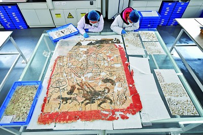 图为文保工作者在修复云冈石窟的壁画。新华社发