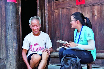 图为西南财经大学中国家庭金融调查与研究中心的研究人员(右)在做调研访谈。