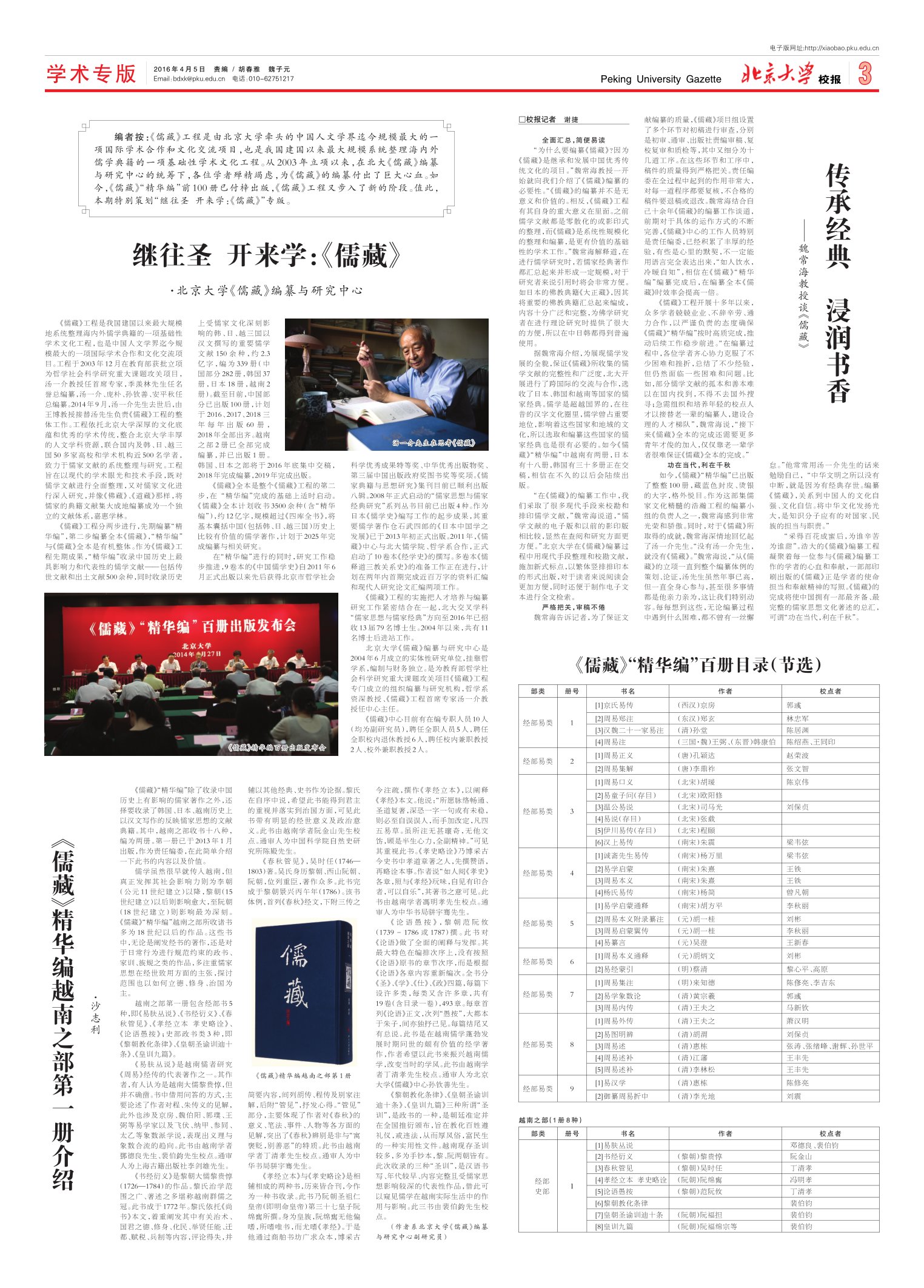 编者按:《儒藏》工程是由北京大学牵头的中国人文学界迄今规模最大的一项国际学术合作和文化交流项目,也是我国建国以来最大规模系统整理海内外儒学典籍的一项基础性学术文化工程。从2003年立项以来,在北大《儒藏》编纂与研究中心的统筹下,各位学者殚精竭虑,为《儒藏》的编纂付出了巨大心血。如今,《儒藏》“精华编”前100册已付梓出版,《儒藏》工程又步入了新的阶段。值此,本期特别策划“继往圣开来学:《儒藏》”专版。
