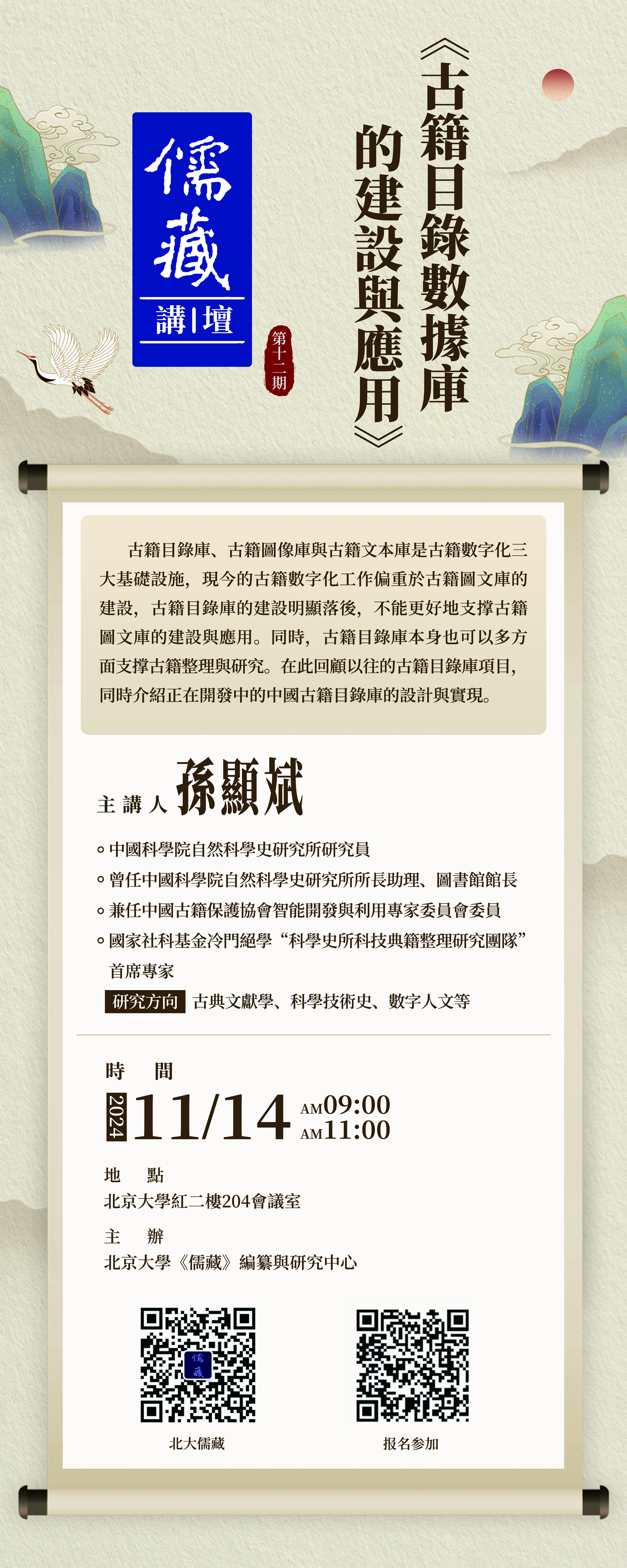 主讲人介绍:孙显斌,中国科学院自然科学史研究所研究员,曾任中国科学院自然科学史研究所所长助理、图书馆馆长,兼任中国古籍保护协会智能开发与利用专家委员会委员,国家社科基金冷门绝学“科学史所科技典籍整理研究团队”首席专家。研究方向:古典文献学、科学技术史、数字人文等。主编《中国古代重大科技创新丛书(第一辑)》,获全国优秀科普作品奖。出版专著《汉书颜师古注研究》、论文集《攻玉集》。“中国科技典籍选刊”主编,第一至七辑获得国家古籍整理出版专项资助。整理《王祯农书》《物理小识》等。主持国家古籍数字化工程专项经费资助项目“历代典籍目录数据集成与分析系统(第一期)”,参与开发“资治通鉴分析平台”“中国历代典籍总目分析系统”等数字人文平台。