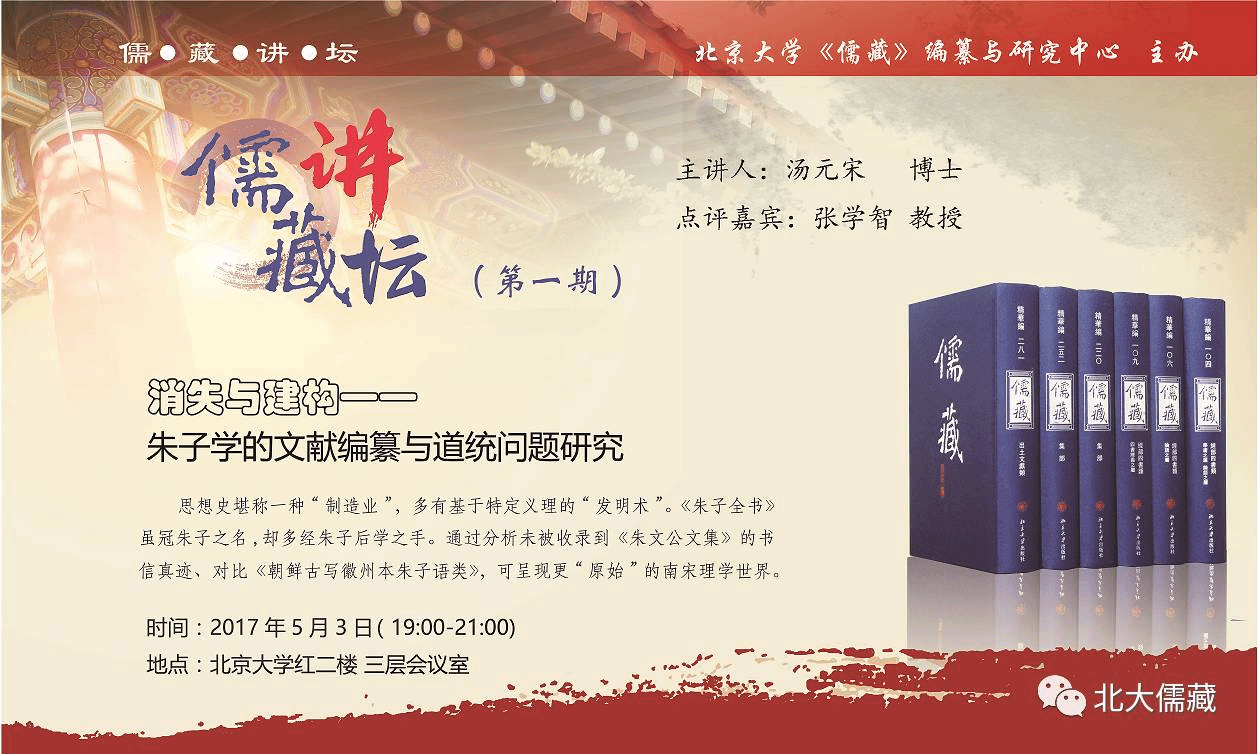2017年5月3日晚,由北京大学《儒藏》编纂与研究中心主办的 “儒藏讲坛”第一期活动顺利举行。本期讲坛由北京大学历史学系博士后汤元宋博士做主题报告,特邀北京大学哲学系张学智教授点评,《儒藏》中心学术委员会主任李中华教授、《儒藏》中心常务副主任魏常海教授出席了活动。