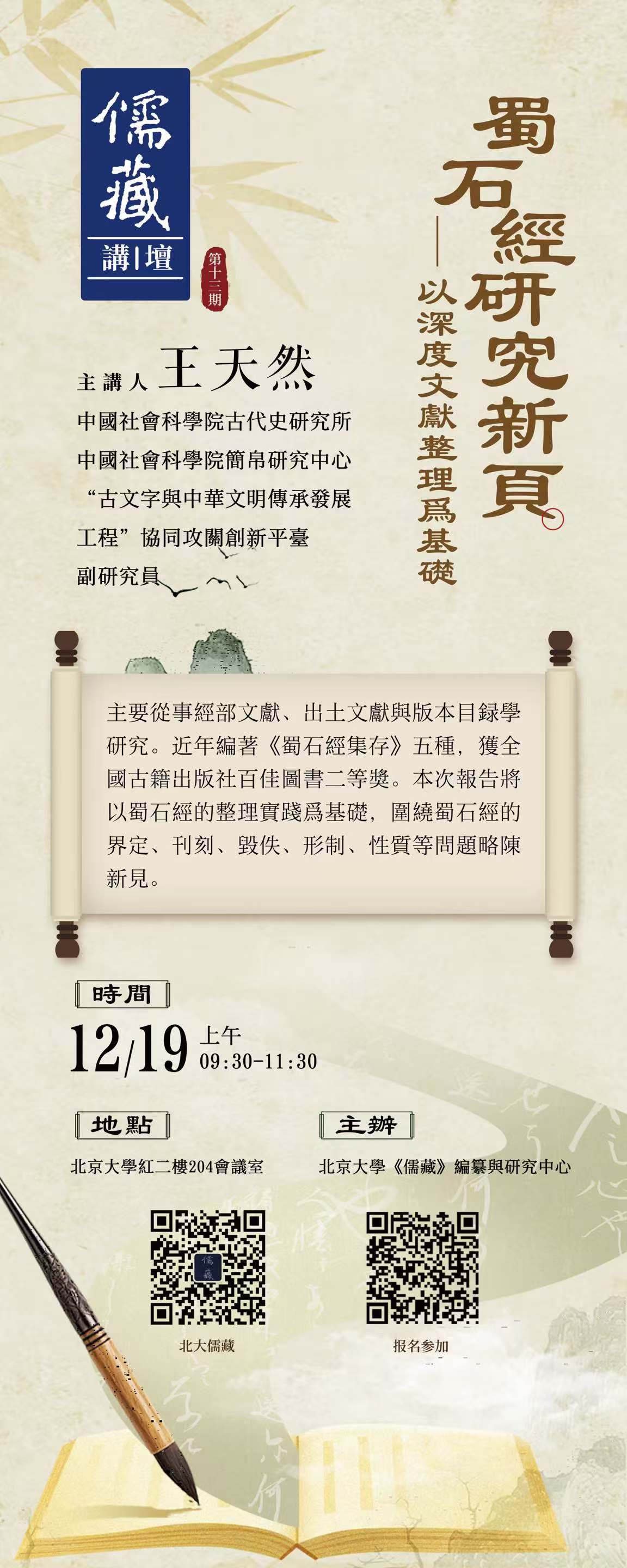 2024年12月19日,中國社會科學院古代史研究所、简帛研究中心副研究員做客北京大學《儒藏》編纂與研究中心主辦的第十三期“儒藏講壇”,開展了一場題爲“蜀石經研究新葉——以深度文獻整理爲基礎”的精彩講座。本期講壇由《儒藏》中心張麗娟老師主持,於北京大學紅二樓會議室舉行。