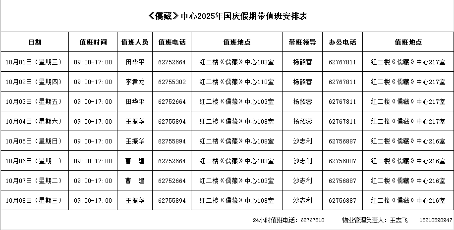 2025年国庆、中秋假期《儒藏》中心值班表